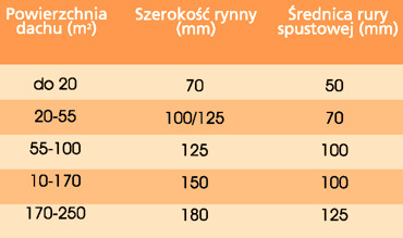 W poniższej tabeli zawarte są zalecane wielkości rynien, w zależności od powierzchni efektywnej dachu.