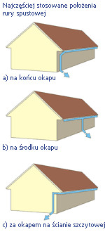 - W przypadku, gdy długość okapu mieści się w granicach 10 - 12 m, montuje się jedną rurę spustową na końcu rynny, w narożniku budynku.